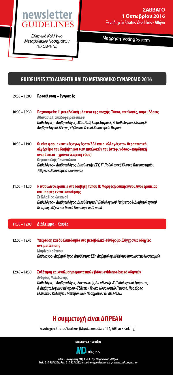 GUIDELINES ΣΤΟ ΔΙΑΒΗΤΗ & ΤΟ ΜΕΤΑΒΟΛΙΚΟ ΣΥΝΔΡΟΜΟ 2016, ΑΘΗΝΑ
