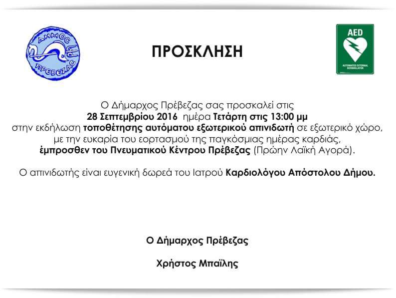 ΠΡΟΣΚΛΗΣΗ ΑΠΟ ΤΟ ΔΗΜΟ ΠΡΕΒΕΖΑΣ