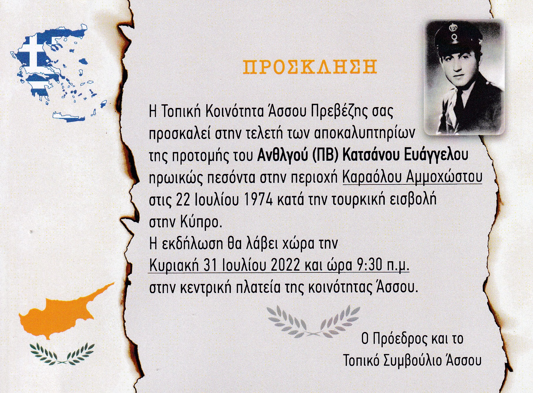 Κοινοποιούμε πρόσκληση σε εκδήλωση απόδοσης τιμής στην περιοχή μας, σε πεσόντα κατά την εισβολή των Τούρκων (Αττίλας) στην Κύπρο τον Ιούλιο του 1974.