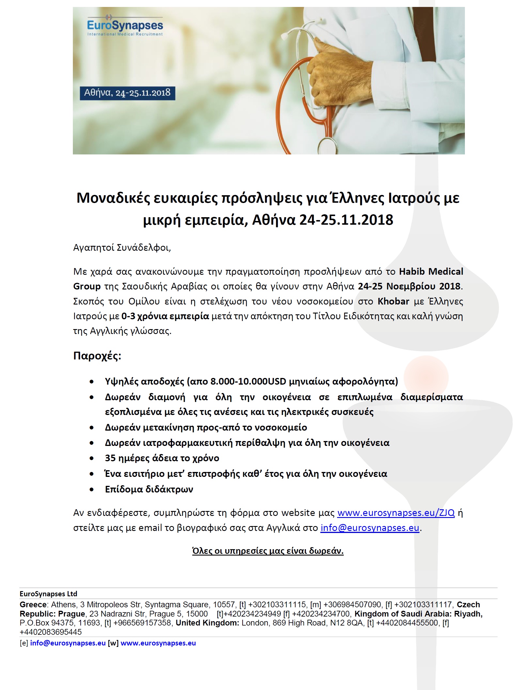 Προσλήψεις νέων Ιατρών, Αθήνα 24- 25 Νοεμβρίου 2018